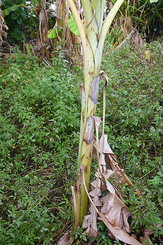 近所でながーーーーい枝打ちばさみを借りてきて、庭のバナナを剪定した。