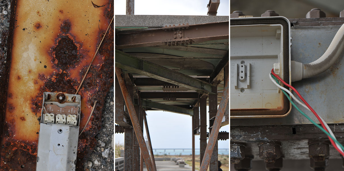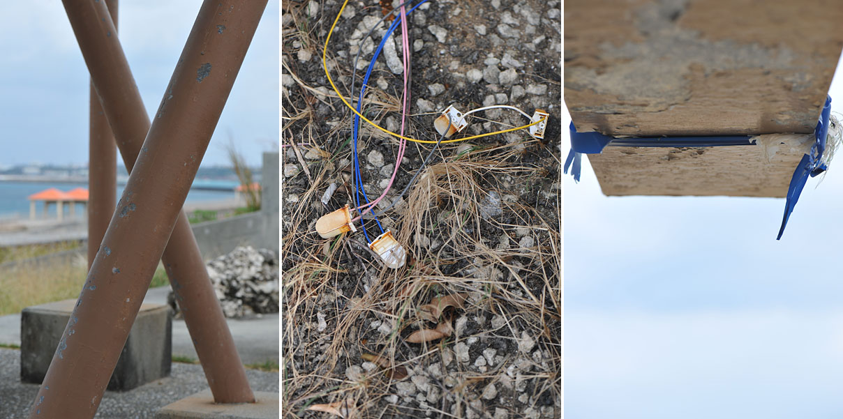 東屋というかシェルターみたいな鉄骨剥き出しの屋根の下に並んだベンチと、朽ちた電線類・・・